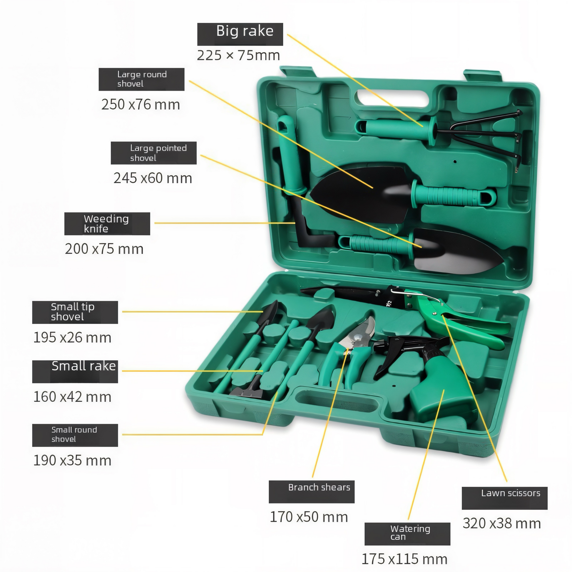 Alles, was Sie für eine professionelle Gartenarbeit benötigen: inklusive Handschaufeln, Rechen, Unkrautstecher, Gartenschere, Rasenkantenschere und Sprühflasche. Ideal für das Pflanzen, Jäten, Beschneiden und Bewässern – sowohl drinnen als auch draußen.