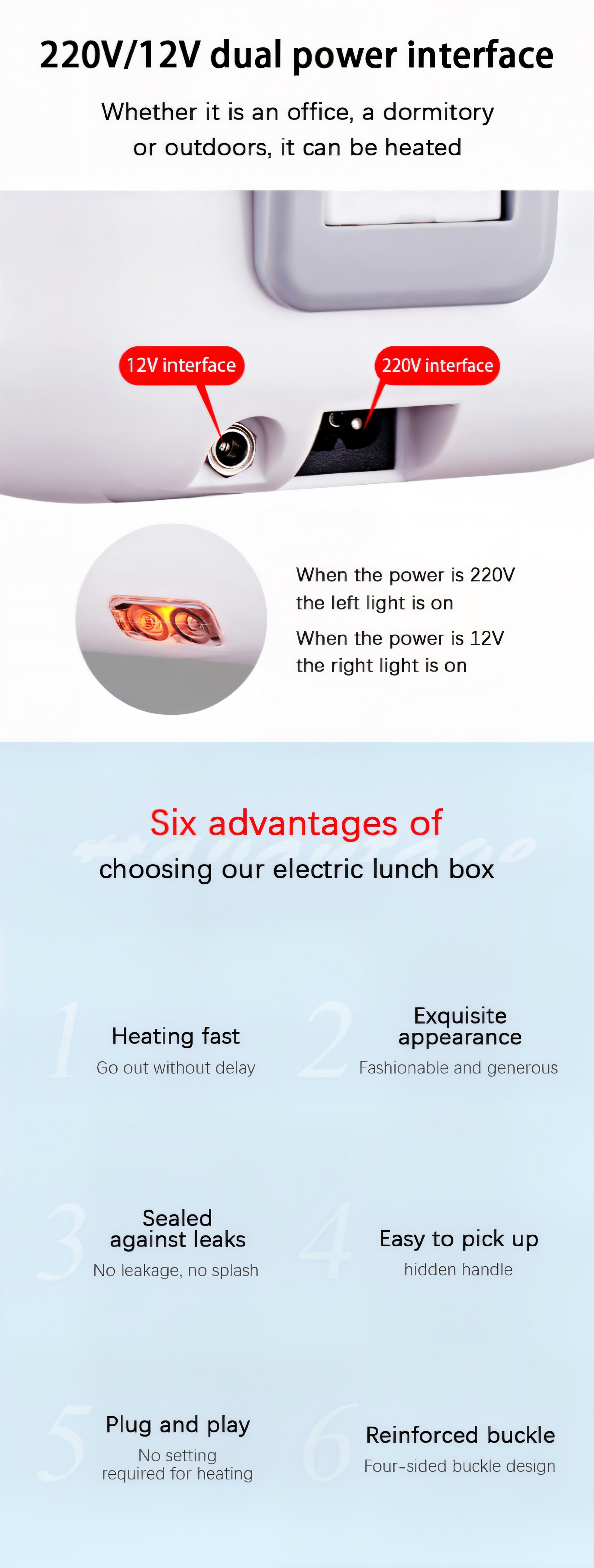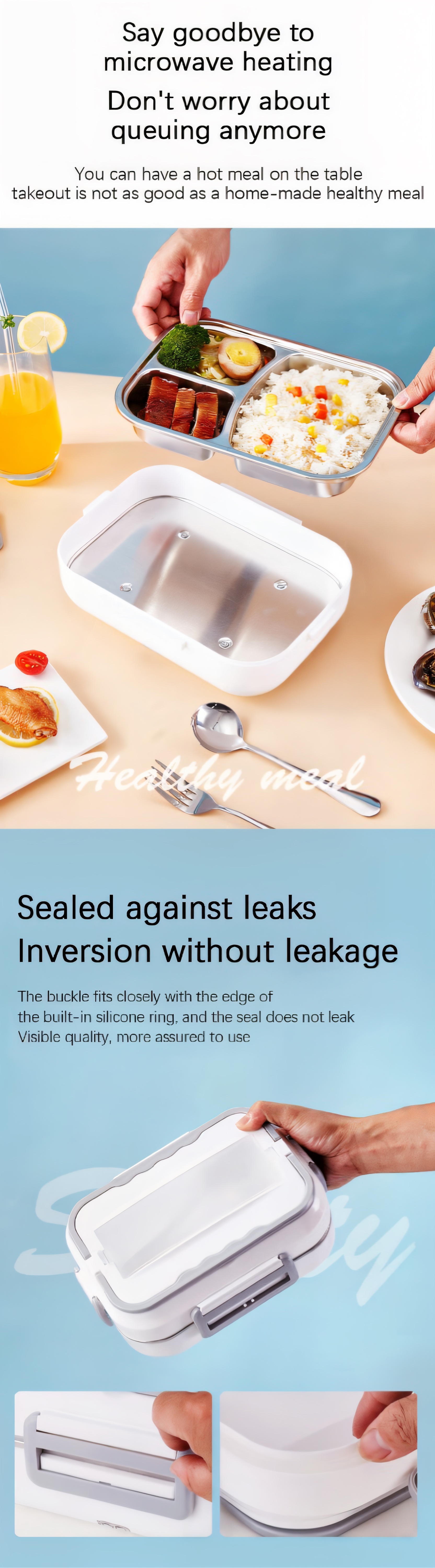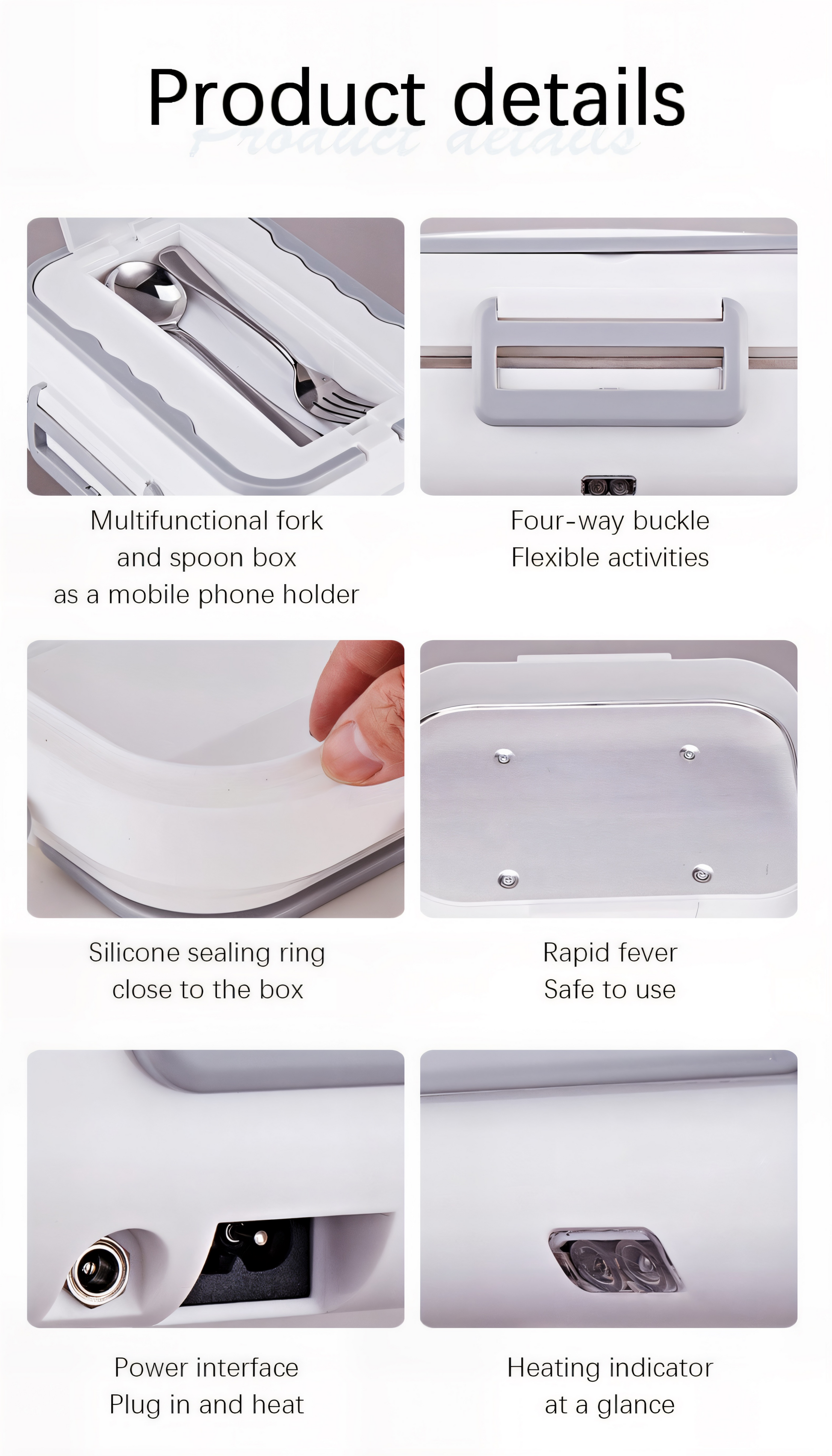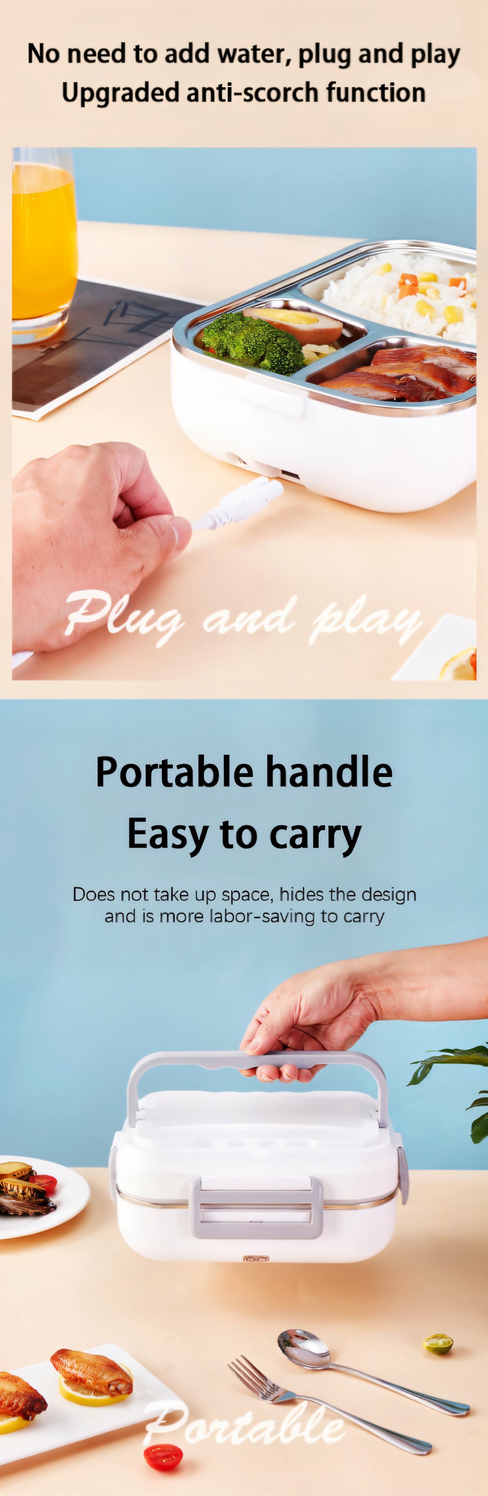 Die elektrische Lunchbox mit 1,5L Fassungsvermögen kombiniert modernes Design mit praktischer Funktionalität. Dank fortschrittlicher PTC-Heiztechnologie erwärmt sie Speisen gleichmäßig und effizient – ohne die Zugabe von Wasser. Das robuste Edelstahl-Innenfach sorgt für eine hygienische Aufbewahrung und ist leicht zu reinigen.
